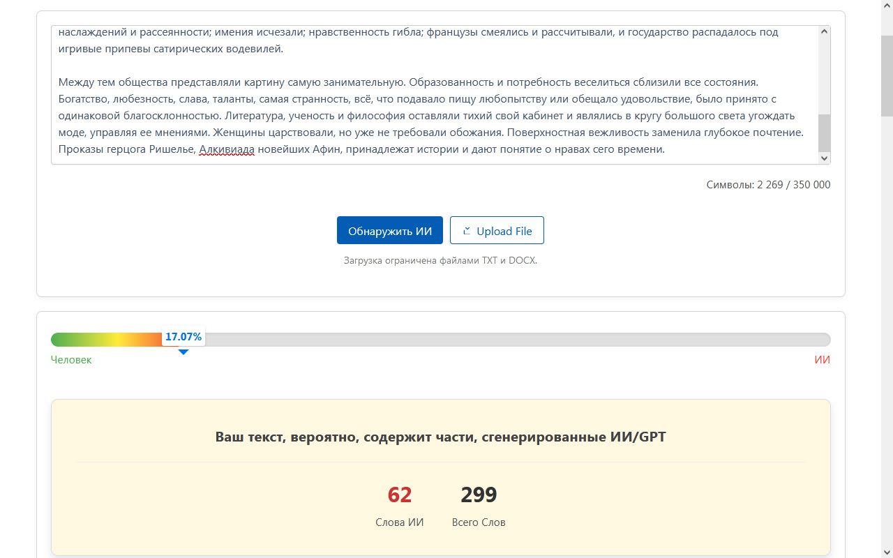 Если что, извиняюсь, я не читал, что там нейронка написала. Как говорится, не читал, но осуждаю. Текст для теста: Источник: https://alexanderpushkin.ru/proza/5-arap-petra-velikogo.html Детектор ИИ: https://aidetectorwriter.com/ru/ Вердикт детектора: Как говорится, "Ай да Пушкин, ай да с#%ин сын". И, кстати, все мои произведения из того сборника по "Сейлор Мун", прогнанные через тот сайт, детектятся как написанные человеком. За исключением, правда, такой штуки, которая идёт у меня в самом начале, и называется "Дисклеймер" (её Undead почему-то не проверял). Так что либо просто разные детекторы по-разному детектят, что явно говорит об их несовершенстве, либо Undead меня просто троллит, выдумывая, что он что-то там чем-то детектил (скринов ведь предоставлено не было). Ну, и как бонус: https://vc.ru/neurocry/1939419-ii-detektory...nalnost-tekstov -------------------- |
