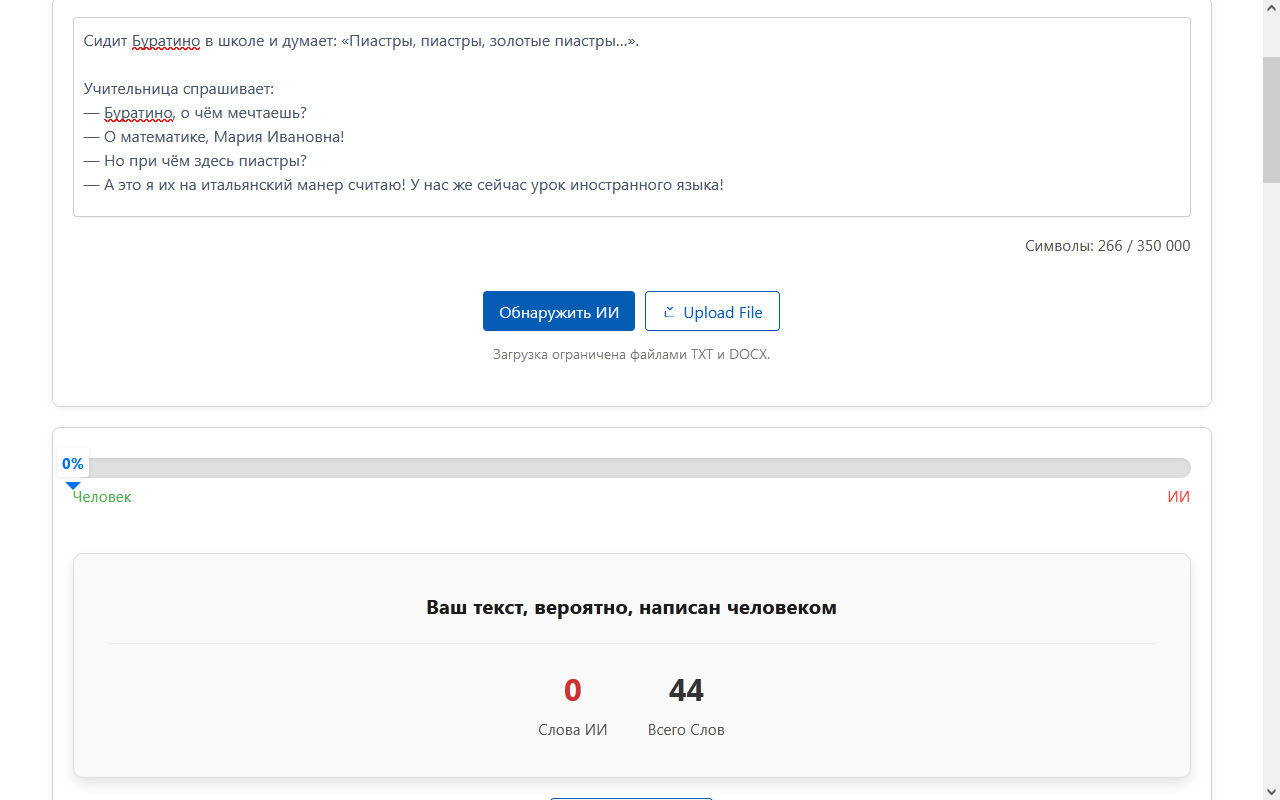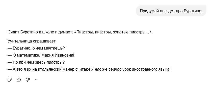 Ну, так нейронки на текстах Пушкина в том числе и обучаются Да хоть на текстах Жириновского. Это никак не оправдывает ложный результат при детекте на "иишность". -------------------------------------------------------------------------------------------------------------------------------------------- Знаете, я решил тут пойти дальше и рассмотреть обратную ситуацию: ![]() Сидит Буратино в школе и думает: «Пиастры, пиастры, золотые пиастры…». Учительница спрашивает: — Буратино, о чём мечтаешь? — О математике, Мария Ивановна! — Но при чём здесь пиастры? — А это я их на итальянский манер считаю! У нас же сейчас урок иностранного языка! ![]() Только, пожалуйста, не надо мне тут лепить бред в стиле "нейронки на анекдотах не обучаются". -------------------- |