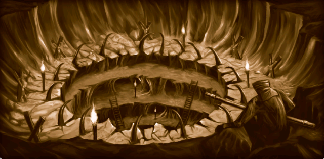 яме скорпионов: классной идеей было бы поместить туда зубцы по краям, большие такие (вспомни ямы рабов из Majesty), а также подвесить клетку. Мол, скармливание преступников скорпионам либо гладиаторские бои - популярное развлечение гипсей, потому эта штука в центре и стоит. Апгрейд ямы мог бы стать очень тёмным и мерцать магическим светом. Ничего, что обрезана, нормально - кроме того, отсутствие построенной ямы не будет так бросаться в глаза на полуотстроенном скрине.