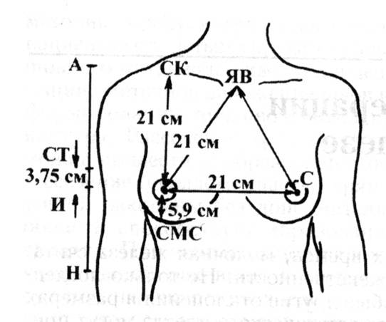 Это 21 см от соска до другого соска, от соска до яремной вырезки, от соска до середины ключицы, 6 см от соска до субмаммарной складки и в пределах 4-х сантиметров проекции ареола на среднюю точку между акромионом и наружным надмыщелком плечевой кости. Размер значения не имеет, главное, чтобы все было пропорционально.